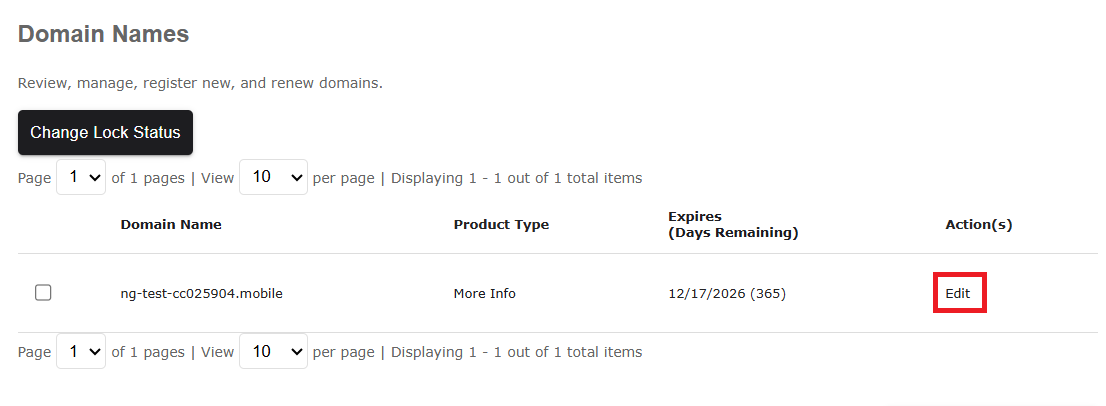 3. Click on any field next to the domain name (e.g., example.mobile) that you wish to Lock/Unlock.