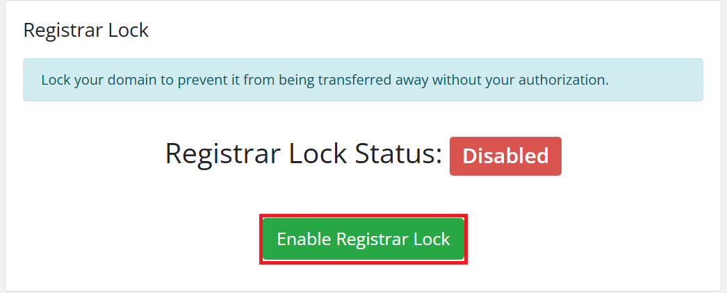 By default, domain names registered through us are automatically "locked". Locking a domain registration is a precautionary measure intended to prevent unauthorized transfers.