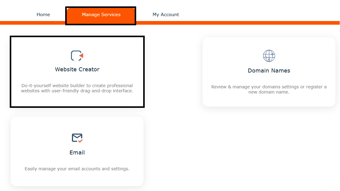 2.1. Alternatively, you can click on the Manage Services menu at the top and select the Website Creator menu.