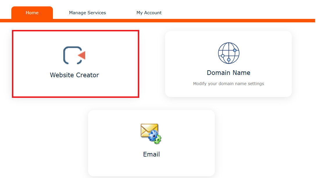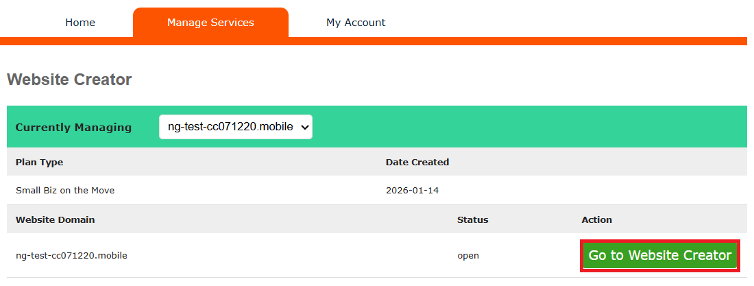 2.1. Alternatively, you can click on the Manage Services menu at the top and select the Website Creator menu.