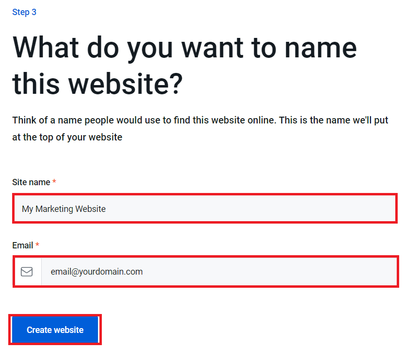 5. In the next step enter your Site name * and Email * address and click on Create Website.