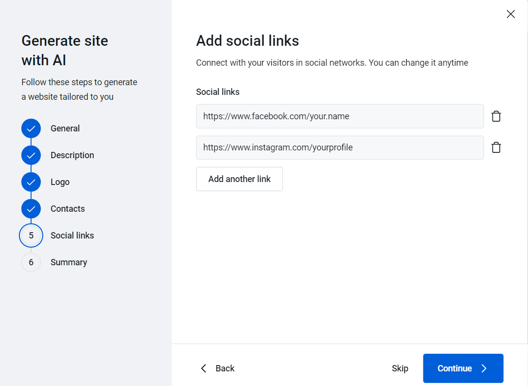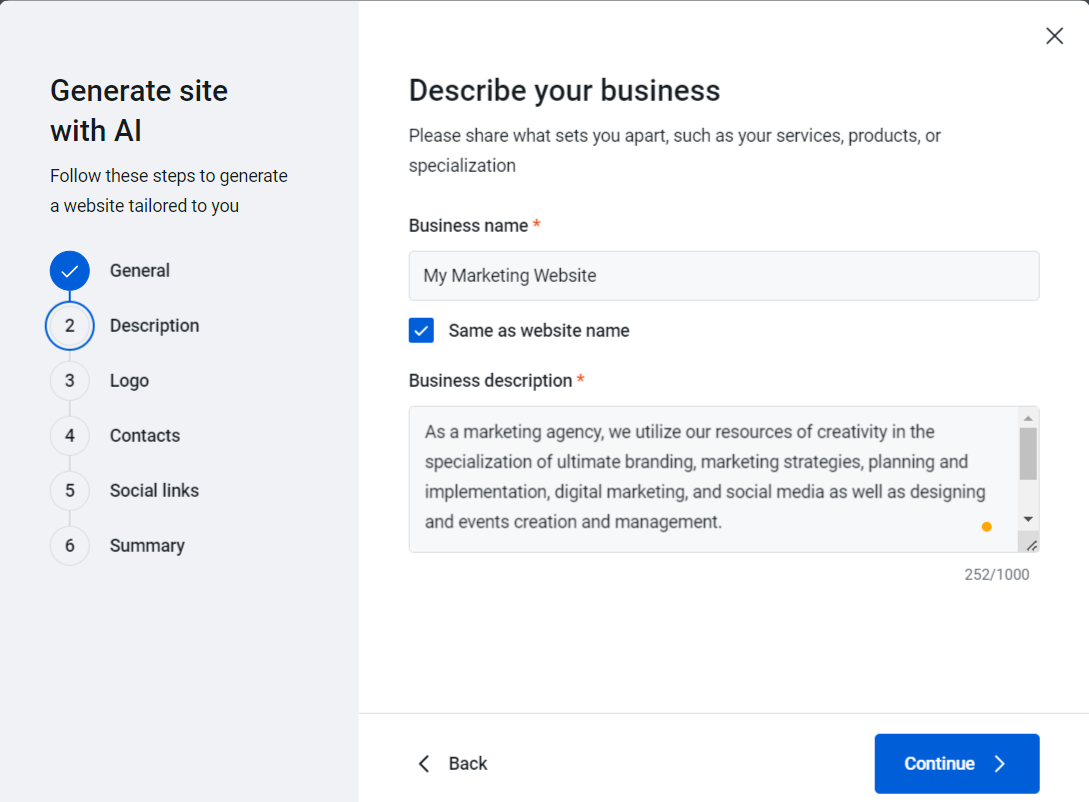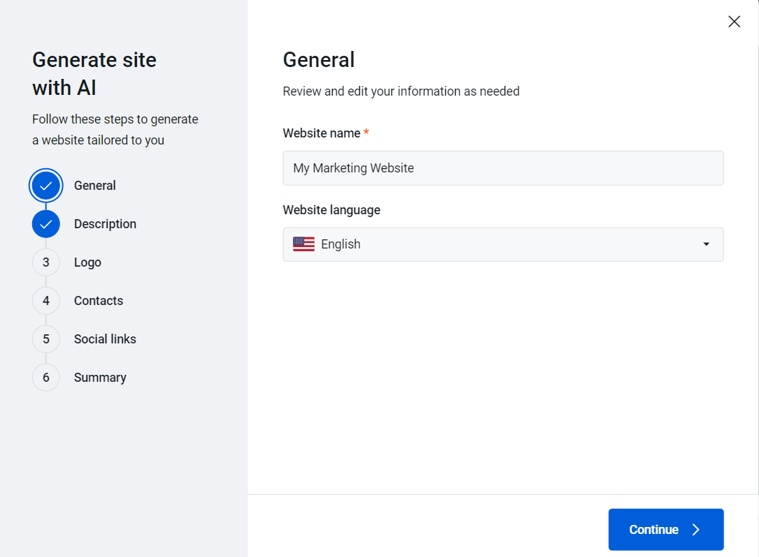 7. The AI Wizard opens and you will need to go through 6 fields where you can enter your website information, based on which the AI Wizard will generate your website content.
