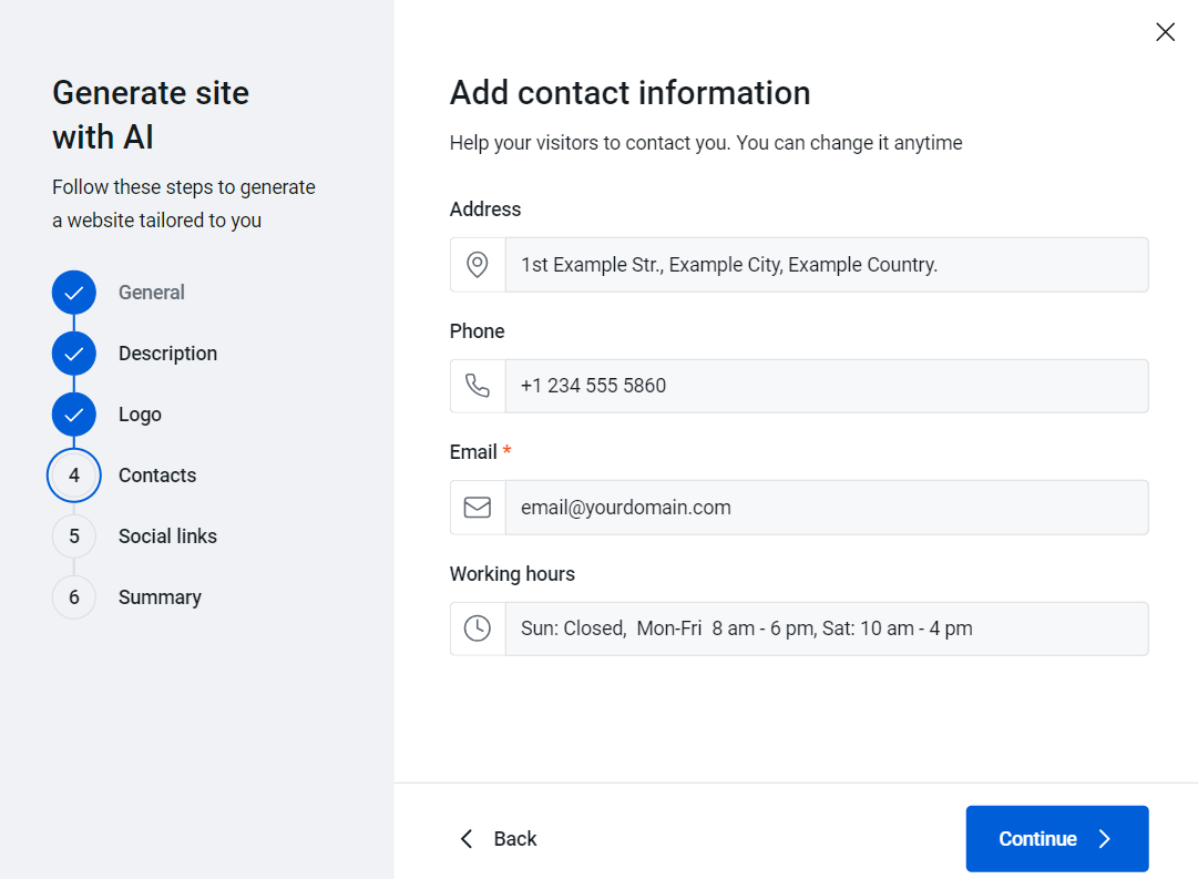 d) Contacts - Enter your Address, Phone, Email * and Working hours. Note that not all fields are mandatory, but it will help personalize your website if you provide more information here.