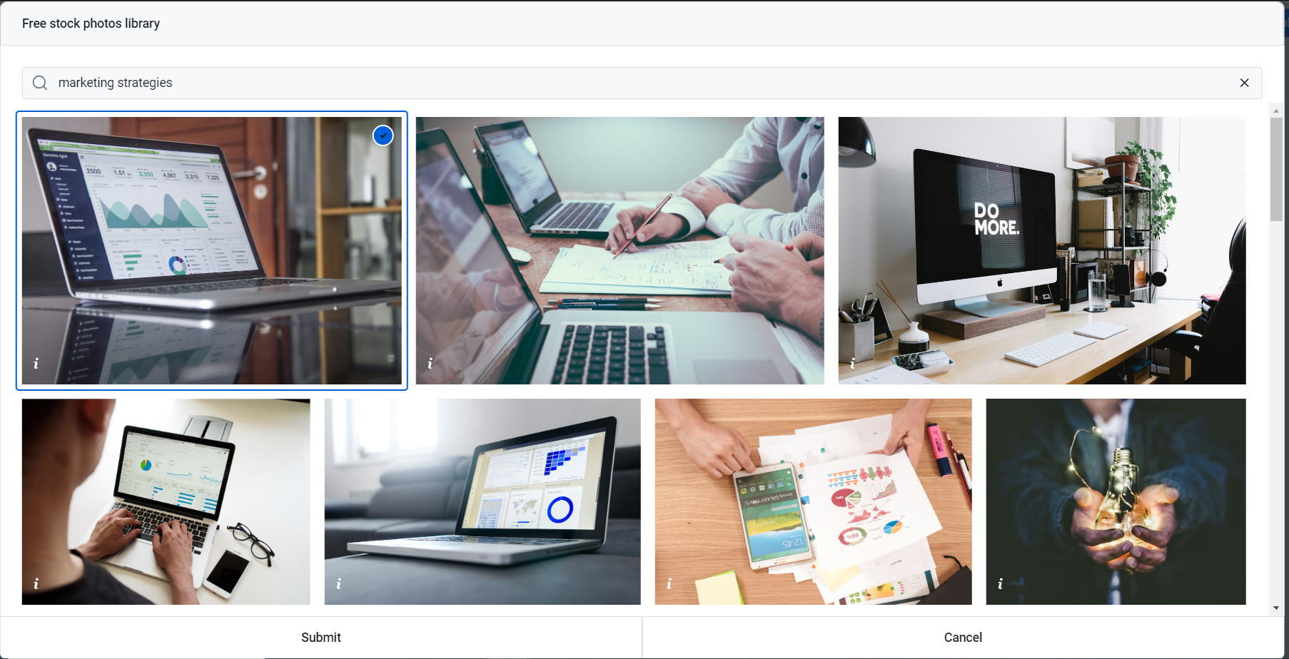 Choose to Upload a file... from your local storage or Browse free stock photos...