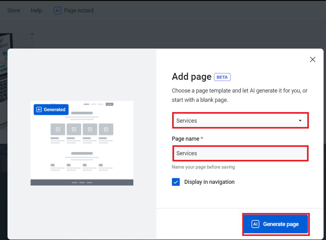 Note: The AI Wizard feature is only available for the Business type website.