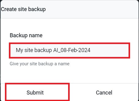 4. Enter the Backup name and click on Submit.