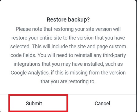 4. Confirm that you want to restore the backup by clicking on Submit in the pop-up window.