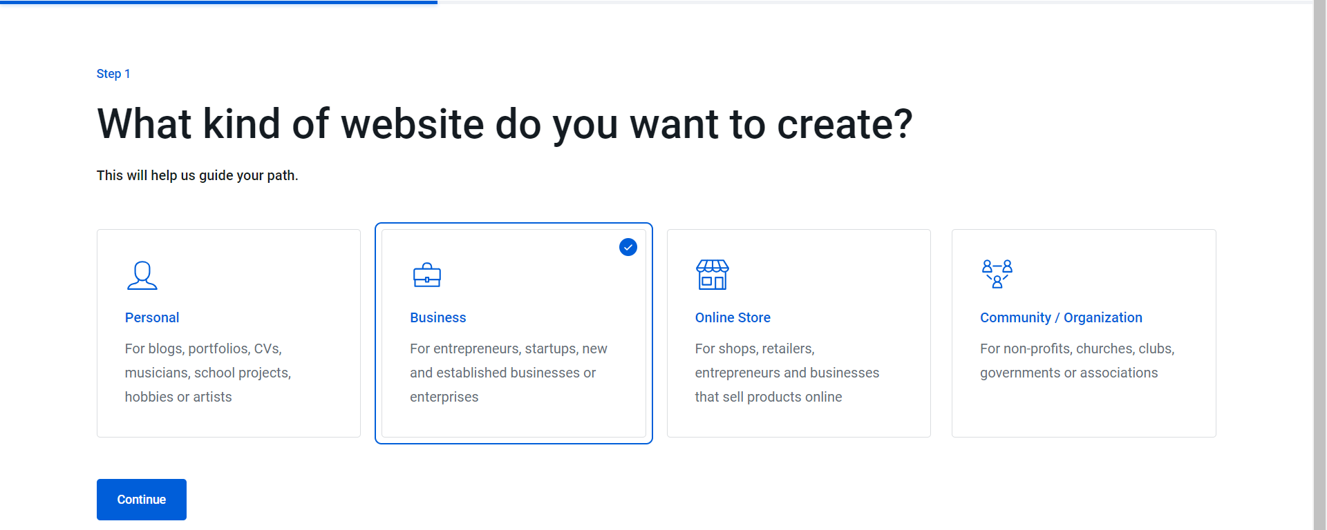 3. If this is the first time you are accessing your Website Builder, you will be prompted to select the type of website that you want to build. Click on Continue once selected.