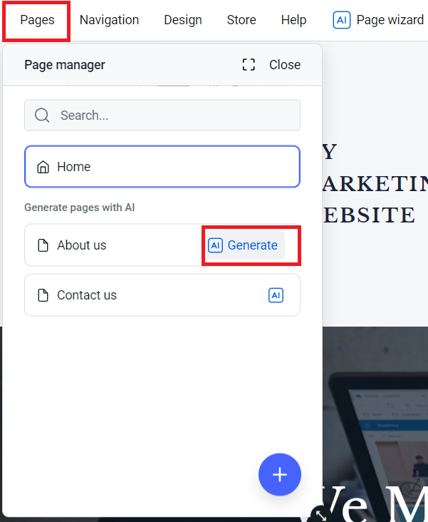 About us & Contact us pages can be AI-generated from within this menu.