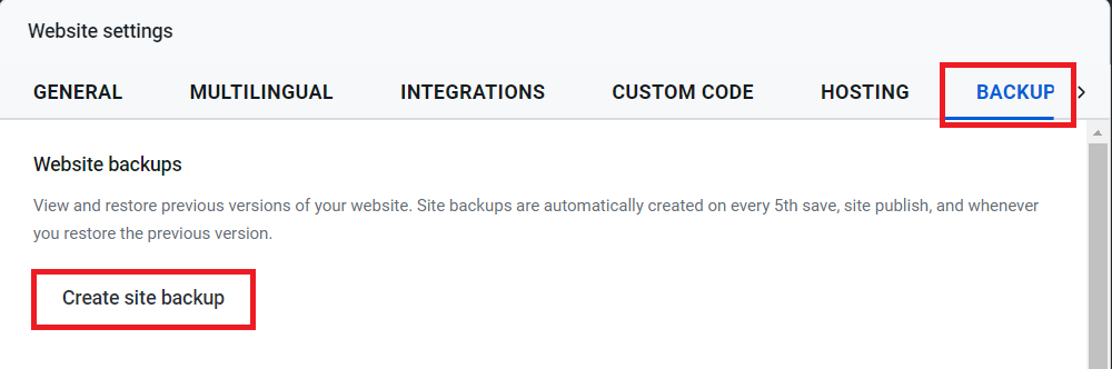 3. Click on the Backup menu and then Create site backup.